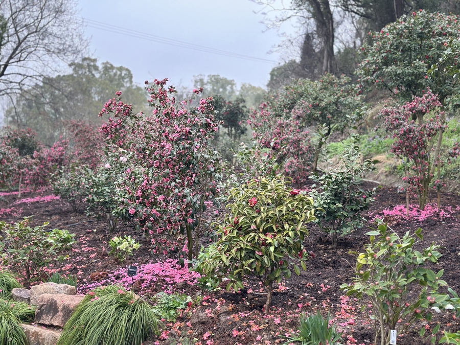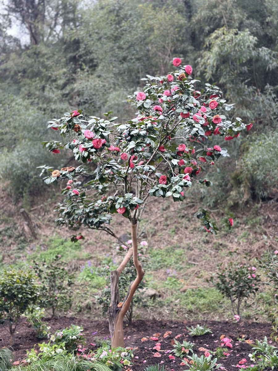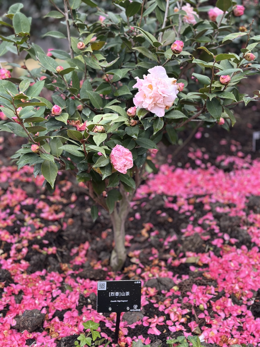 在辰山植物园新揭牌的芳香山茶花谷内,种满了各个品种的山茶花。无论是娇嫩的粉色还是浓烈的红色,亦或是有香味的品种及一人多高的“花树”,都演绎着山茶花之美。雨后山茶花瓣铺满一地,象征着合作与希望的山茶树苗则被栽种于花谷沃土中。